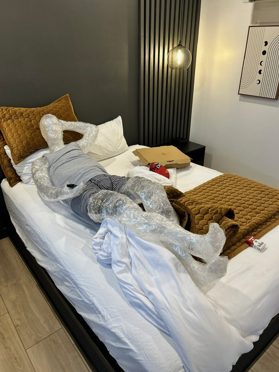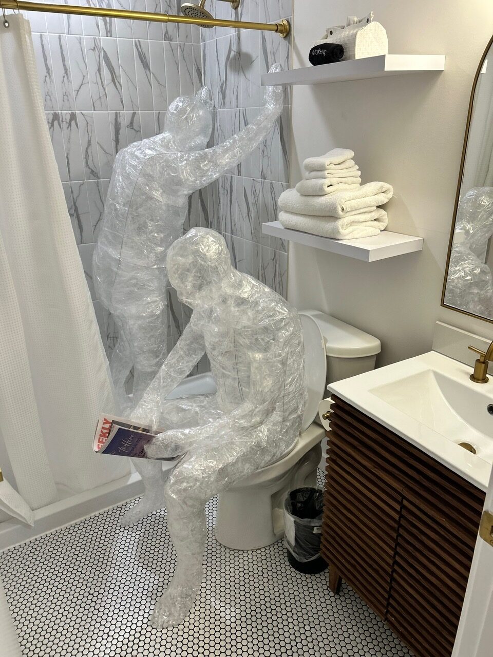 This site-specific installation was created in collaboration with fellow Boise Open Studios Collective member Andrew Groth. We were honored to be one of six artist teams selected for the inaugural partnership between Surel’s Place and the Arcadia Hotel in Garden City. The event, aptly titled ARTcadia, took place on December 5, 2025. From the beginning, our goal was to fully embrace the idea of site-specific work—creating an installation that could only exist in, and directly respond to, the hotel environment. Hotels are places where people temporarily inhabit space, collect experiences, and then leave with memories. This led us to ask a simple question: What if the hotel had memories too? If so, the only thing it could remember would be its guests. The ghost-like figures in the room represent those lingering memories—echoes of past occupants. Constructed from armature wire, Saran wrap, and packing tape, the figures possess a translucent, ethereal quality. Their semi-transparent surfaces catch and reflect light, creating a subtle sparkle that enhances their otherworldly presence. Each figure was formed by wrapping an actual body in Saran wrap, layering armature wire over the surface, and then taping the structure together. The taped form was carefully cut off the body and reassembled, resulting in a hollow, life-sized impression of human presence without permanence. This project was a meaningful and rewarding experience, and both Andrew and I hope that ARTcadia continues to grow and return as a yearly event.
