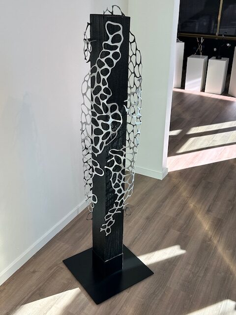 This work exists at the intersection of death and regrowth, serving as a metaphor for the transformations we experience throughout life. Relationships end, jobs change, phases pass, and mindsets evolve. Each ending represents a quiet death of who we once were, making space for who we are becoming. From every ending emerges a new beginning. The process is cyclical—mirrored in the steel, biomorphic structure that envelops the charred wood armature—where destruction and renewal coexist in a continuous state of becoming.