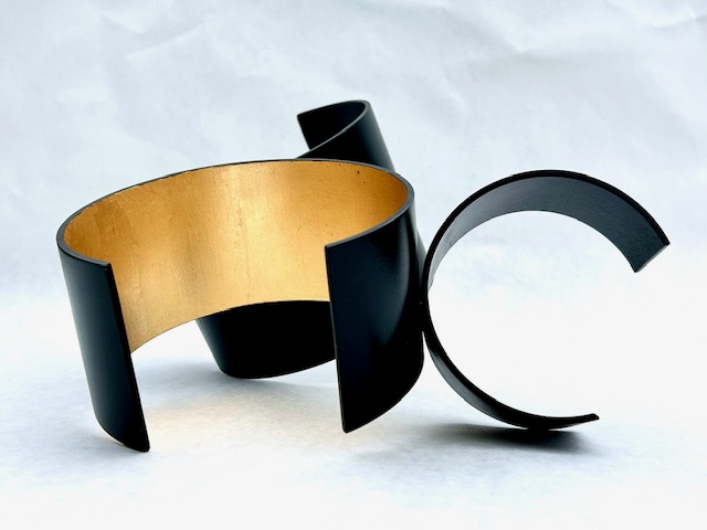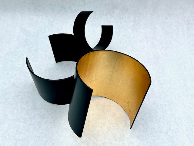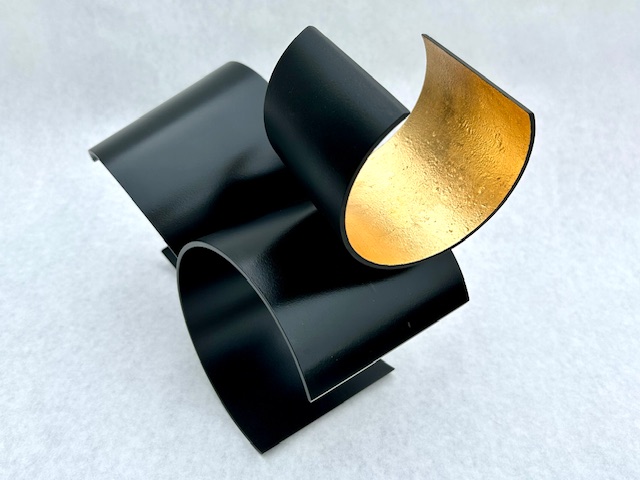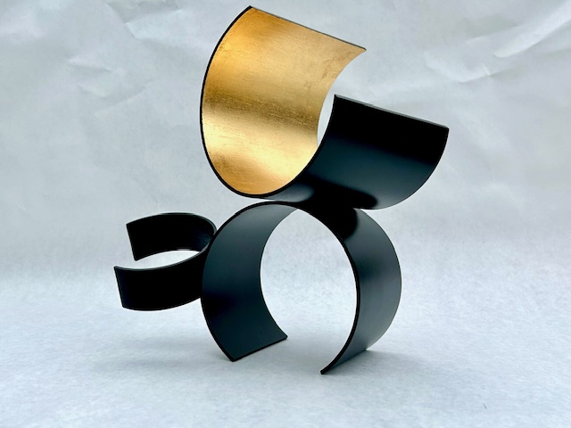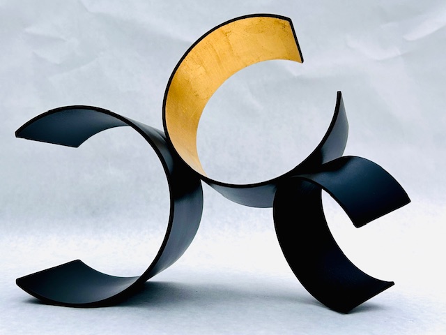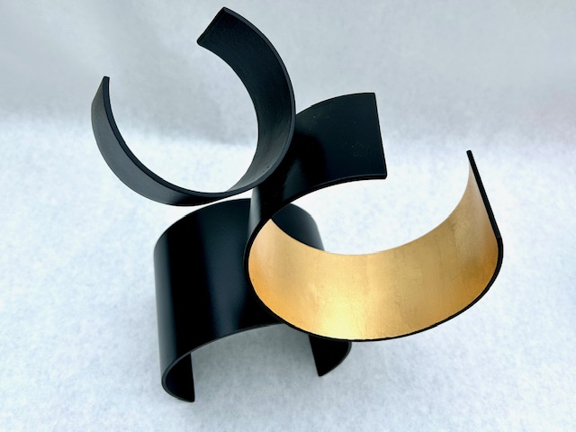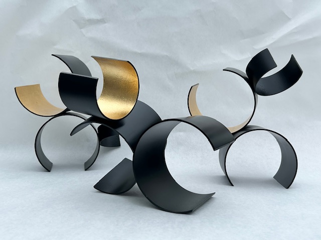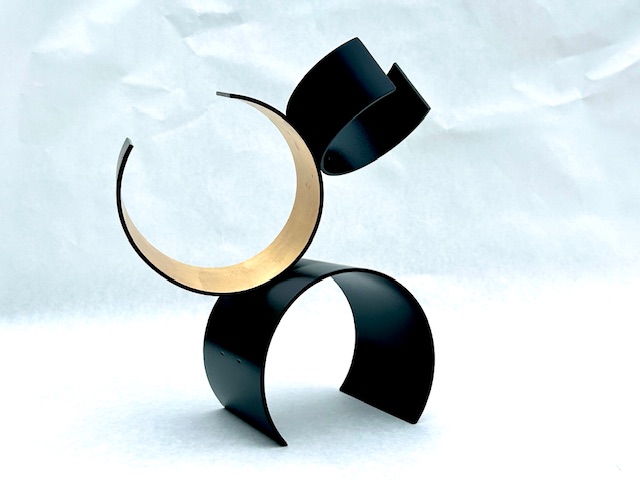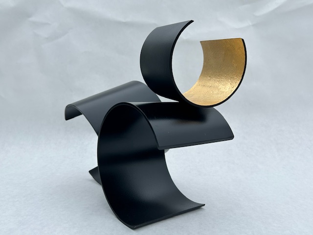 This work is part of an original series of small sculptures created to document my personal transformation—from a career in the Air Force, to wife and mother, and ultimately to artist. The use of marred and pitted industrial waste pipe, shaped by years of use and then discarded in a salvage yard, mirrors that journey. Through its transformation into a new, intentional form, the material reflects my own evolution in life, where experience, wear, and change become sources of strength and beauty.