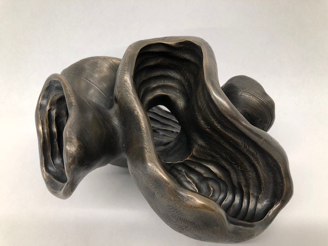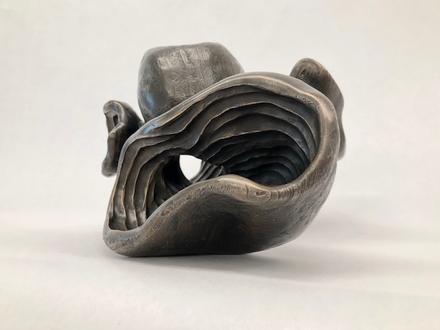 This bronze sculpture, completed during the final semester of my BFA, began as a focused study in texture. The original form was sculpted in clay, digitally scanned, and 3D printed using a meltable PLA—similar to wax—before being cast in bronze through the ancient lost-wax casting process. While the initial clay form did not contain the layered lines introduced by 3D printing, their presence created a striking surface quality reminiscent of fingerprints. Recognizing their visual and tactile beauty, I chose to preserve these lines in the final bronze. The title of the piece draws inspiration from the resonant sounds produced while working the form with metal tools, as well as the rich, robust texture that defines its surface.